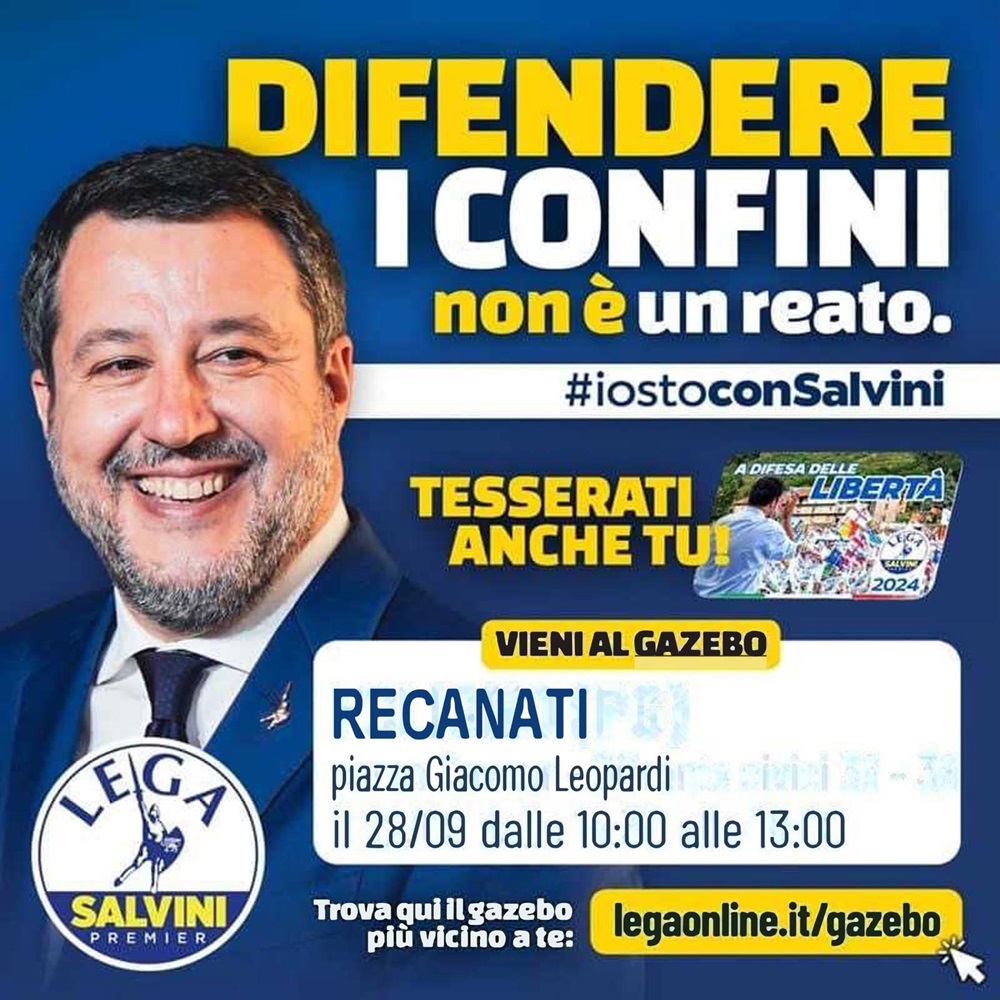 Anche la Lega Recanati si mobilita per il suo leader Matteo Salvini con due gazebo organizzati per la raccolta firme a favore del vicepremier: sabato 28, dalle 10 alle 13 in Piazza Giacomo Leopardi, e domenica 29 settembre dalle 10 alle 13 nel quartiere di Villa Teresa, zona supermercato.