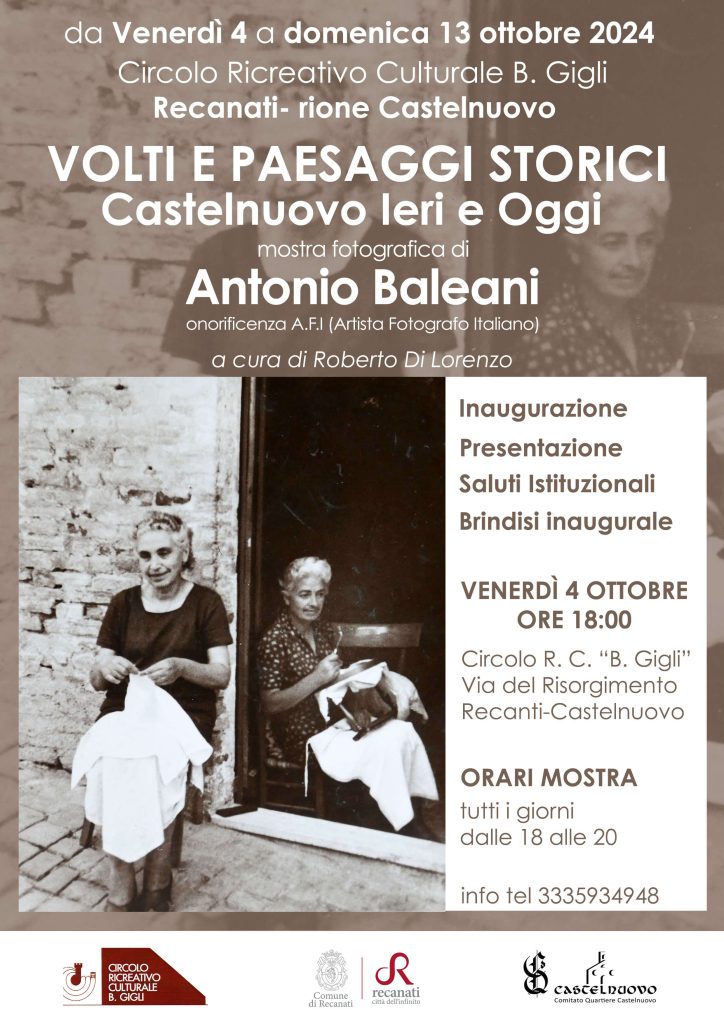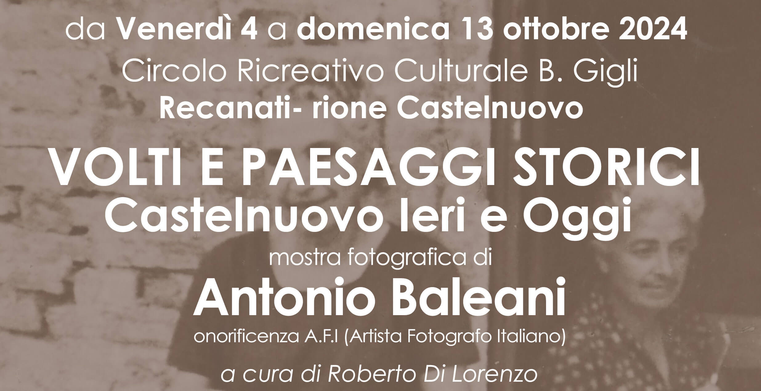 “Volti e Paesaggi. Castelnuovo Ieri e Oggi” è il titolo della mostra fotografica che si terrà negli spazi del Circolo Ricreativo Culturale Beniamino Gigli da venerdì 4 a domenica 13 ottobre 2024 nell’ambito della festa parrocchiale “Castelnuovo in Festa”. Questa mostra rappresenta un omaggio al nostro amato quartiere, esplorando la sua evoluzione attraverso l’obiettivo del fotografo Antonio Baleani.