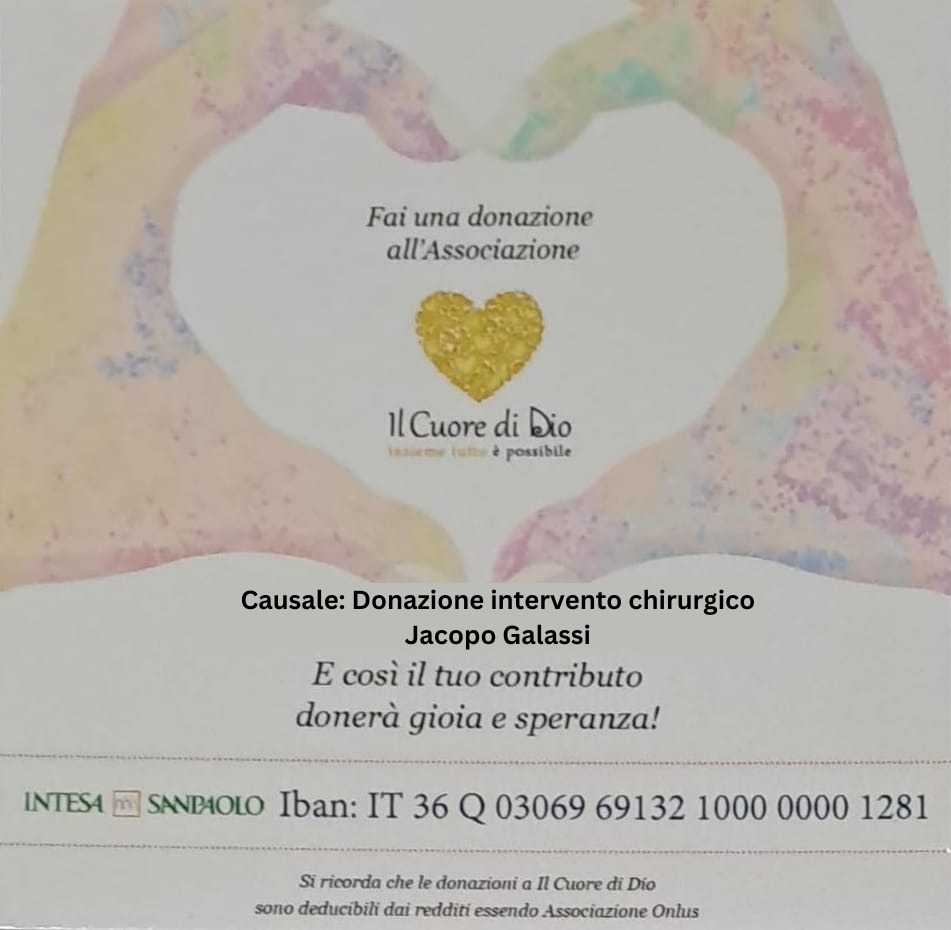 Si sono mobilitati in molti, fra cui il gruppo Alpini di Castelfidardo e Recanati, di cui il padre è il capo gruppo, e l’associazione Iustissima civitas, ma soprattutto l’associazione di volontariato recanatese “Il Cuore di Dio” che fa capo a Marco Ottaviani. La Onlus è già attrezzata a raccogliere le offerte che giungeranno e che dovranno pervenire a “Il Cuore di Dio” – IT36Q0306969132100000001281 – causale: *donazione intervento chirurgico Jacopo Galassi*. Le donazioni a “Il Cuore di Dio” sono deducibili essendo un’Associazione Onlus.