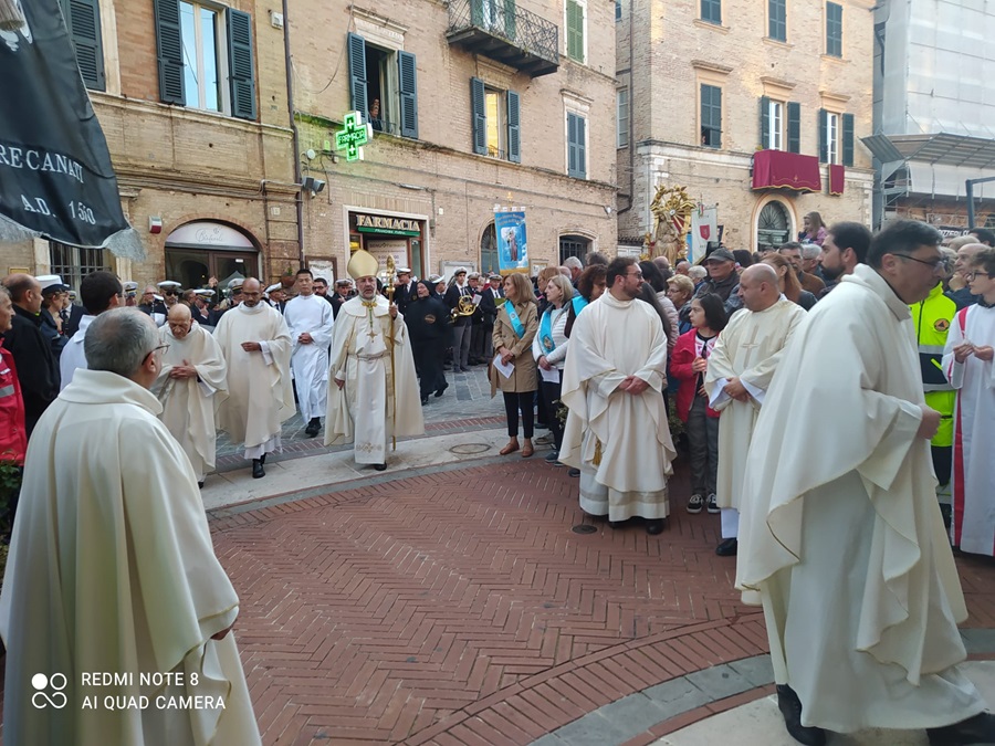 Tanti fedeli oggi pomeriggio per la riapertura, dopo anni di restauro e interventi di consolidamento antisismico, della chiesa di san Domenico, in piazza Leopardi, a Recanati. La processione, in onore della Beata Vergine del Rosario, è partita alle 17,30 dalla chiesa di Sant’Agostino per arrivare alle 18 in piazza Leopardi dove il vescovo Marconi ha benedetto il portone con ai lati due leoni in marmo, dell’antica chiesa di fondazione romanica, costruita in città dopo l’arrivo dei Padri Domenicani nel 1272. L’occasione per la sua riapertura è stata questa prima domenica di ottobre dove in città per antica tradizione si celebra la “Festa della Vittoria” per ricordare quanto accaduto nel 1571 quando le forze cristiane della Lega Santa sconfissero le truppe ottomane nella battaglia di Lepanto combattuta nelle acque greche, alla quale presero parte ben 108 recanatesi guidati dal Capitano Paolo Gigli. Riaperto il portone, la chiesa si è presentata ai fedeli nel suo massimo splendore riportando alla memoria dei presenti i tanti momenti della vita passata della comunità recanatese. In chiesa anche il gonfalone della città scortato dal sindaco Pepa che non ha mancato di ricordare come “la chiesa ha un ruolo fondamentale, è una risorsa attiva per le comunità e per lo sviluppo economico, sociale e culturale del territorio incentivando il senso di appartenenza dei suoi abitanti”.