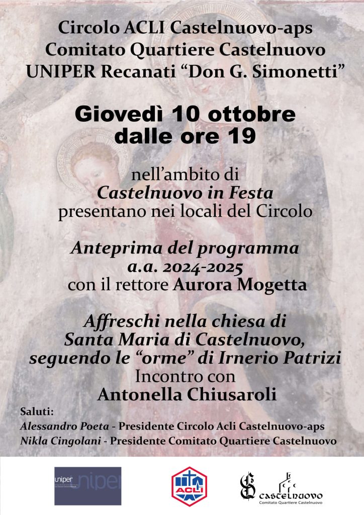 Giovedì 10 ottobre alle ore 19, nell’ambito di Castelnuovo in Festa, della parrocchia di Santa Maria Assunta, al Circolo ACLI Castelnuovo-aps Recanati si terrà l’anteprima del programma Uniper, Università d’Istruzione Permanente “Don Giovanni Simonetti”, dell’anno accademico 2024-2025.