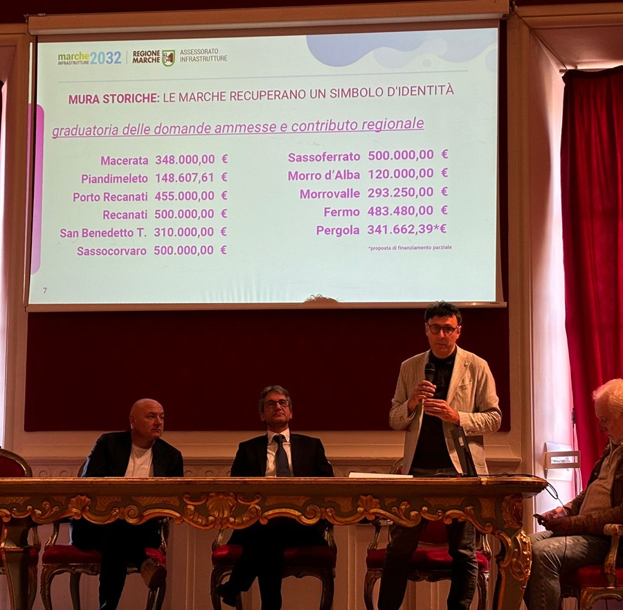 Conferenza stampa questa mattina a Recanati, nell’Aula magna del Comune, dell’assessore regionale ai lavori pubblici Francesco Baldelli per presentare l’esito della graduatoria dei finanziamenti a fondo perduto che la regione Marche ha stanziato per il restauro e la valorizzazione delle mura storiche dei comuni marchigiani.