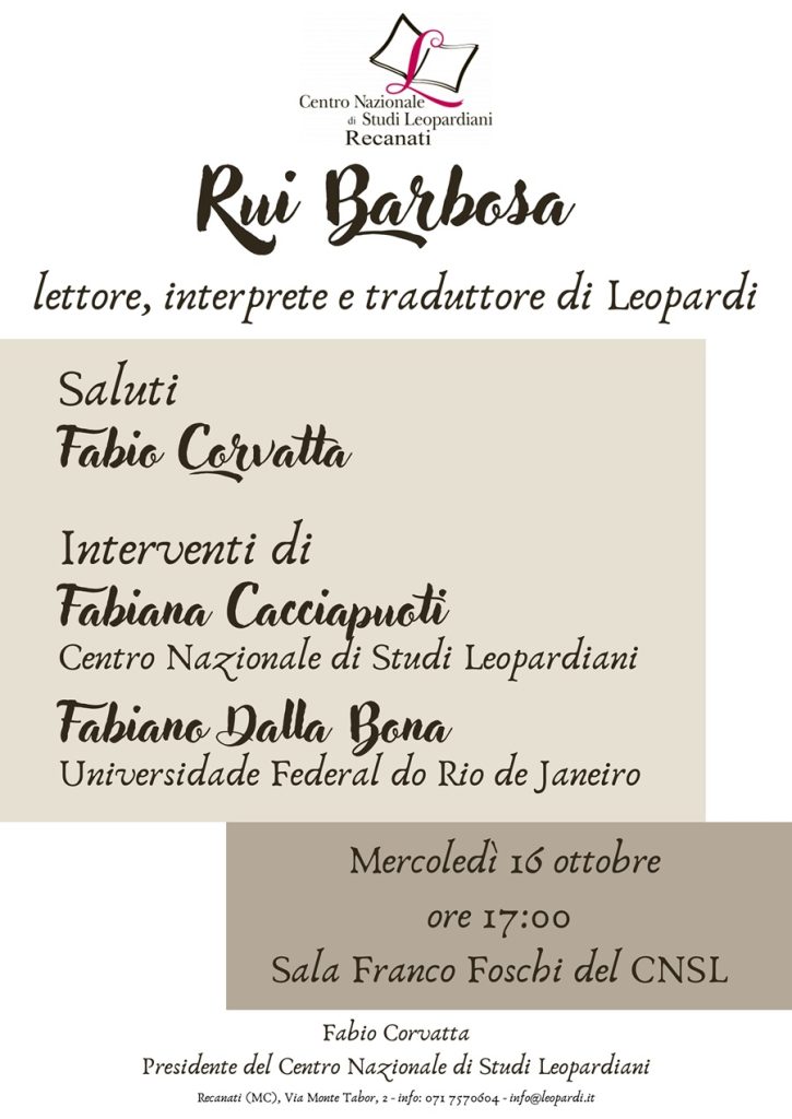 Mercoledì pomeriggio, alle ore 17, presso il CNSL si terrà la Conferenza su “Rui Barbosa – lettore, interprete e traduttore di Leopardi”. Interverranno il Prof. Fabiano Dalla Bona dell’Universidade Federal do Rio de Janeiro (Brasile) e la Prof.ssa Fabiana Cacciapuoti. Saluti del Presidente del CNSL, Fabio Corvatta. Ingresso libero.