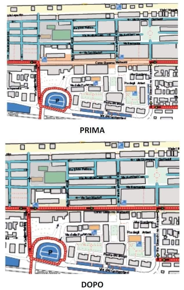 Nelle nuove tavole è scomparsa l’isola pedonale che rendeva interdetto il traffico da via Rossini a via Galilei. Quel tratto di corso Matteotti è diventato a senso unico verso sud da Via Galilei fino all’Hotel Mondial.Sul Corso, su via De Gasperi e via Verdi, piccole variazioni sugli stalli per le moto e le auto e qualche differenza nelle misure complessive di Corso Matteotti che in alcuni tratti passa da 11 a 11.50 mt. Queste ultime o erano sbagliate prima o la strada si è allargata a seguito …della pioggia.