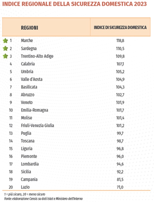 A partire dallo scorso anno, Censis e Verisure Italia hanno costruito il primo Indice Regionale della Sicurezza Domestica, che valuta sia la sicurezza della zona di residenza che quella all’interno dell’abitazione.