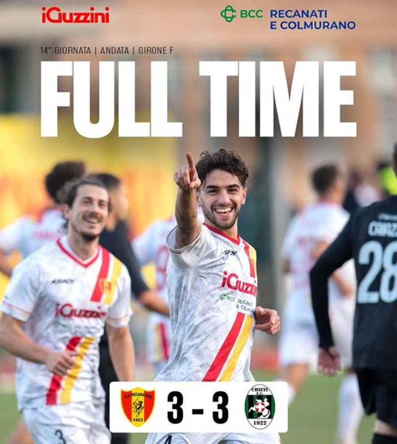 Quando ormai le cose sembrano mettersi male contro un Chieti ben organizzato, la sconfitta viene evitata al 32′ grazie a una bella azione di Alfieri che entra in area e viene steso. Rigore sacrosanto che lo stesso Alfieri trasforma per il 3 a 3. Nell’ultima parte il Chieti resta in 10 per l’espulsione di Forgione per doppia ammonizione e la Recanatese tenta il colpaccio ma al 36′ Daniel Ferrante in area di rigore coglie soltanto l’esterno della rete e pochi minuti dopo Canonici di testa mette i brividi al portiere ospite. Buona prova della Recanatese sotto il profilo della manovra con ottimi spunti di D’Angelo e Alfieri tra i migliori in campo, ma la difesa probabilmente si è fatta ancora una volta sorprendere troppo facilmente con il portiere Del Bello che in un paio di occasioni non si è fatto trovare pronto all’uscita.