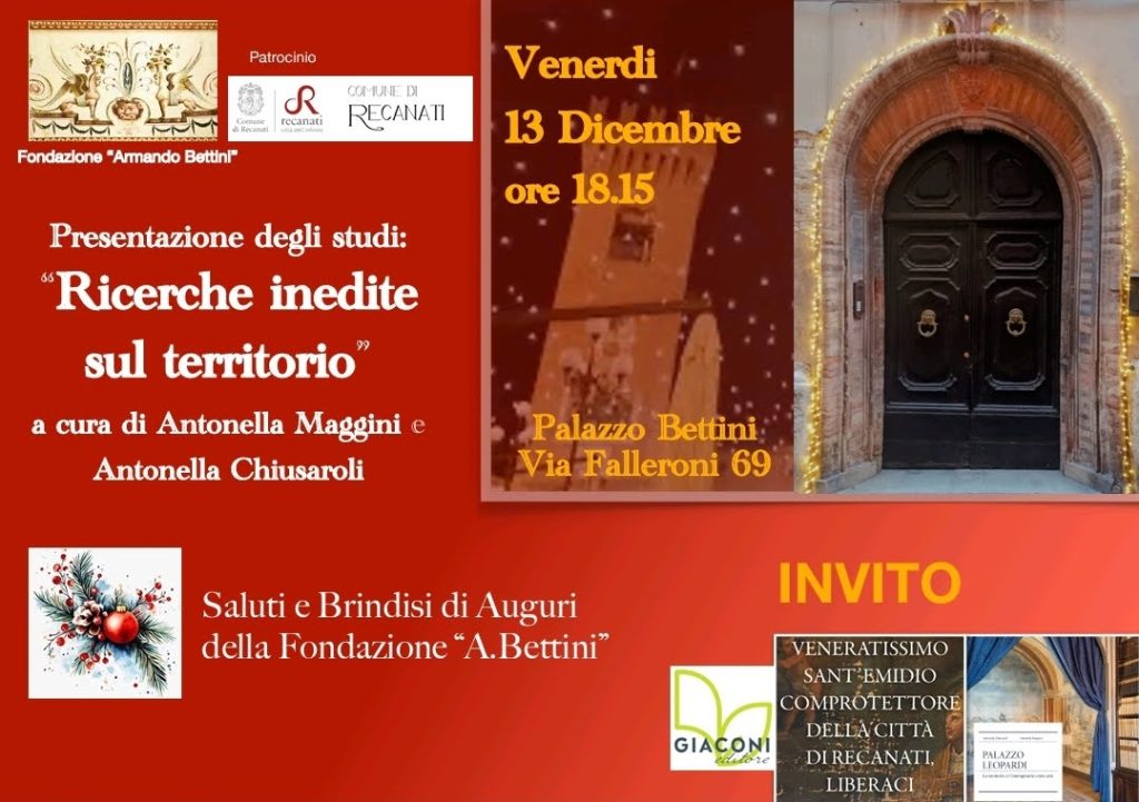 Venerdi 13 dicembre alle ore 18.15 presso i locali a piano terra di Palazzo Bettini in Via Falleroni 69 la FONDAZIONE ‘Armando Bettini´ organizza l’evento culturale “Ricerche inedite sul territorio” presentate dai Antonella Maggini e Antonella Chiusaroli, docenti scrittrici e appassionate di storia locale.