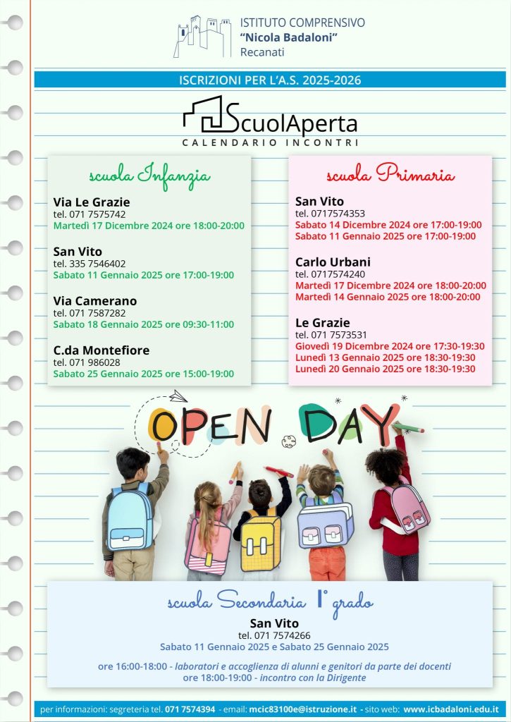 L’Open Day rappresenta un’ottima occasione di incontro per vedere la scuola, visitare gli spazi, conoscere il corpo docente e avere tutte le informazioni relative alle iscrizioni alle varie sezioni.