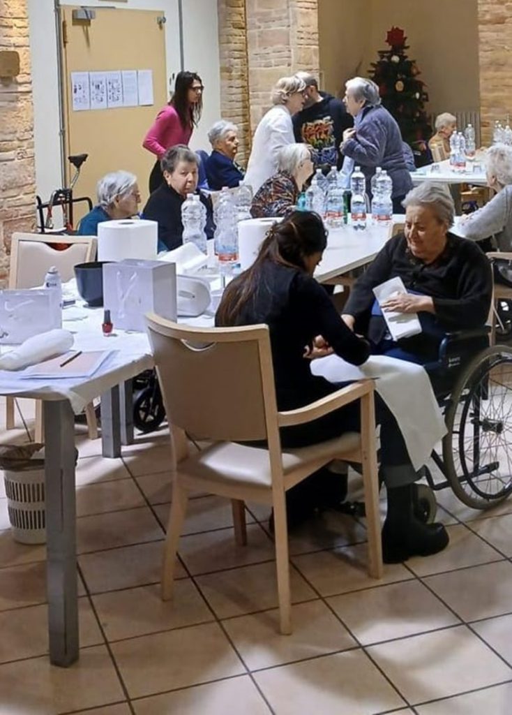 Per le signore hanno chiamato un’estetista che ha provveduto a curare le mani ad ognuna di loro e, in qualche caso, anche a dare una spennellata di smalto rosso natalizio sulle unghie mentre per gli uomini è giunto in sede Gabriele della barberia “Sandro e Gabriele” che ha provveduto a un bel taglio di barba e capelli per ogni “nonno”: “poche piccole cose, ma che per gli anziani sono carezze dal valore inestimabile, commenta Ficara Pigini.