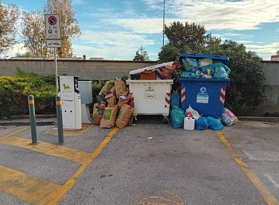 La scena è paradossale: un’area dedicata alla ricarica delle auto elettriche a Villa Teresa di Recanati, davanti alla scuola materna e a fianco della casa-albergo per anziani, si trasforma, per ironia del destino, in una “discarica” improvvisata. Sacchetti di rifiuti e cassonetti straripanti hanno invaso lo stallo riservato rendendo impossibile l’accesso alle colonnine di ricarica.