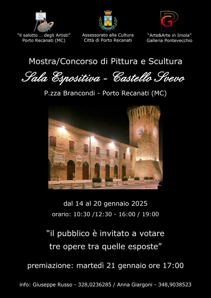Nella Sala Espositiva del Castello Svevo, P.zza Brancondi di Porto Recanati, martedì 14 gennaio si è inaugurato il Concorso di Pittura e Scultura promosso dalle Associazioni Culturali “il salotto … degli Artisti” di Porto Recanti (MC) e “Arte&Arte” Galleria Pontevecchio, di Imola (BO), in collaborazione con l’Assessorato alla Cultura Città di Porto Recanati.
