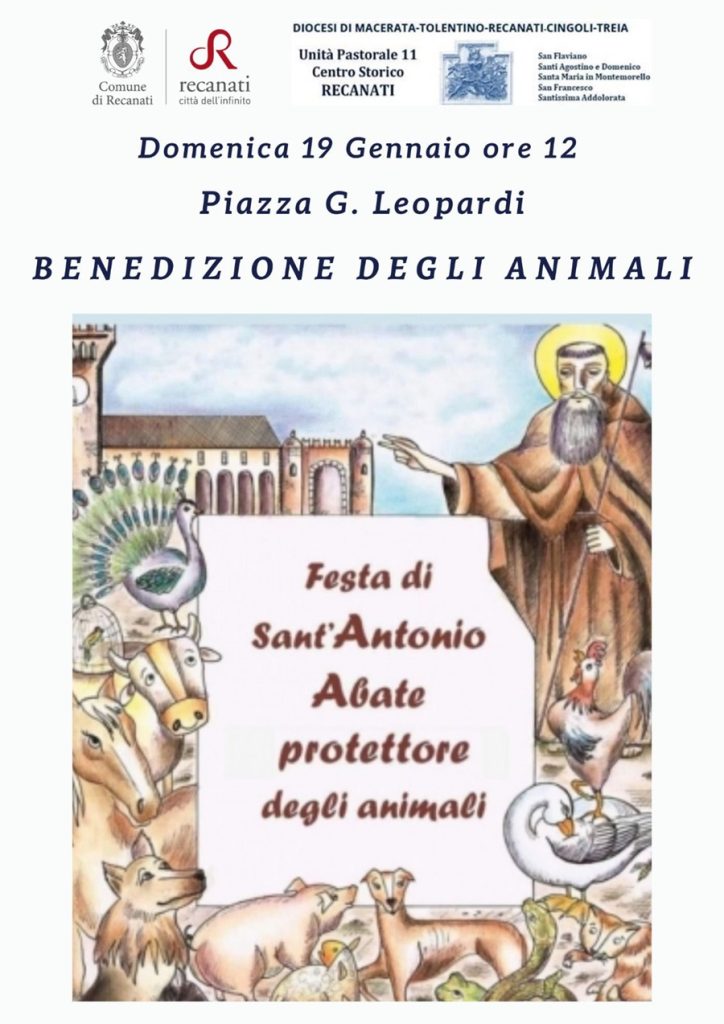 Domenica 19 gennaio alle ore 12, in Piazza Leopardi sarà celebrata la tradizionale festa di Sant’Antonio Abate, con l’attesa benedizione degli animali e del pane del Santo e la distribuzione del pane benedetto, in una manifestazione da sempre sentita e partecipata organizzata dalla Parrocchia di S. Agostino e S. Domenico e dalla Diocesi di Macerata-Recanati e dal Comune di Recanati.