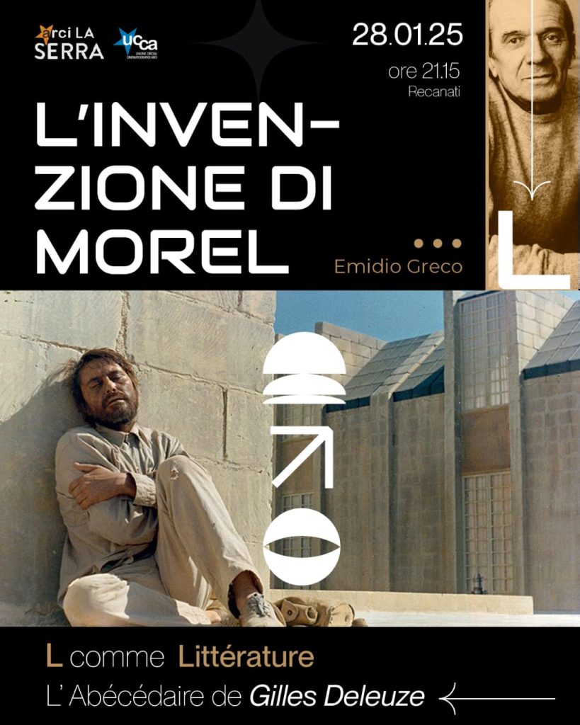 Martedì 28 gennaio 2025 alle ore 21:15, presso il Circolo ARCI/UCCA La Serra di Recanati, verrà proiettato il film L’invenzione di Morel” di Emidio Greco. Il film verrà preceduto da un estratto dell’intervista televisiva “L’ Abecedaire de Gilles Deleuze” andata in onda sul canale Arté dopo la sua morte. È così che in “L comme Littérature” Deleuze parla di rapporti e similitudini tra l’attività della creazione di concetti tipica della filosofia e quella di creazione di personaggi tipica della letteratura. Il film che seguirà sarà invece “L’invenzione di Morel” (1974) di Emidio Greco, in cui i personaggi del film rimangono incastrati nei paradossi temporali creati da una macchina.