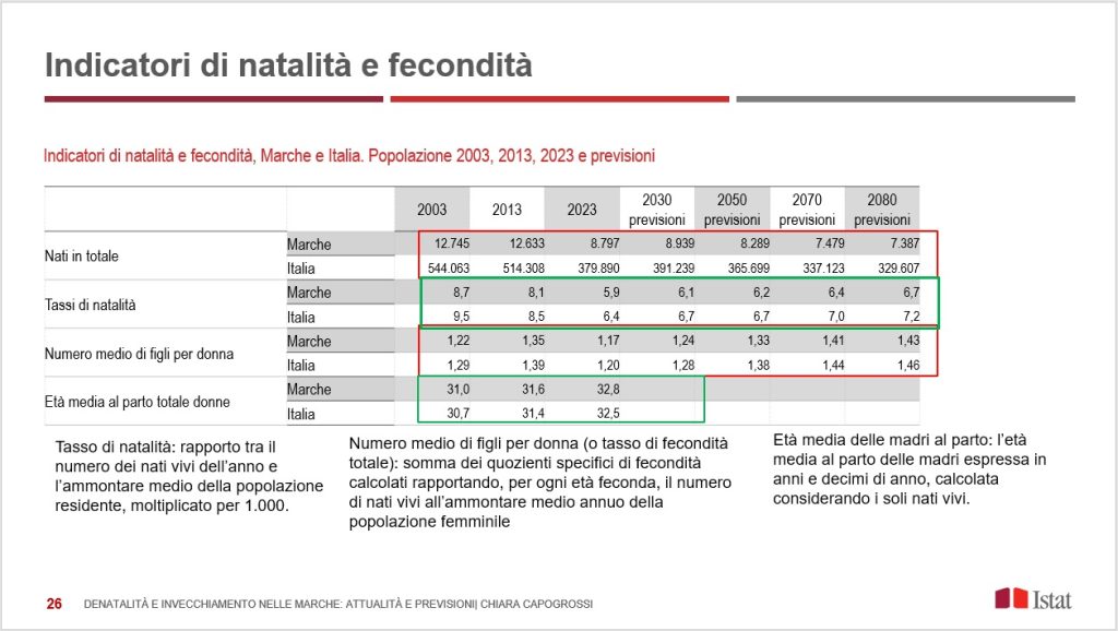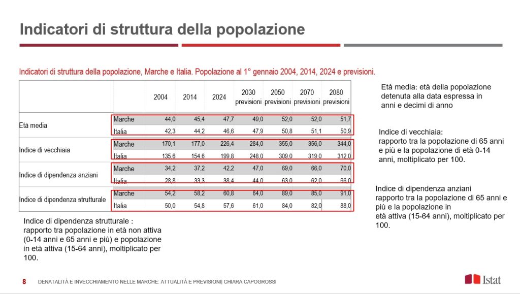 L’attuale situazione demografica delle Marche dice che l’età media è di 47,7 anni, che abbiamo 226,4 anziani oltre il 65 anni ogni cento ragazzi tra 0 e 14 anni; nel 2023 ogni donna marchigiana aveva 1,17 figli a testa (il tasso necessario per il ricambio della popolazione è di 2,1) e i nati in totale sono stati 8.797. Nel 2080, se continua questo trend, l’unico indice che migliorerà sarà quello del numero di nati per donna marchigiana, che passerà a 1,43, mentre tutti gli altri peggioreranno: l’età media salirà a 51,7 anni, il numero di anziani ogni cento ragazzi arriverà a 344 e i nati scenderanno a 7.387.