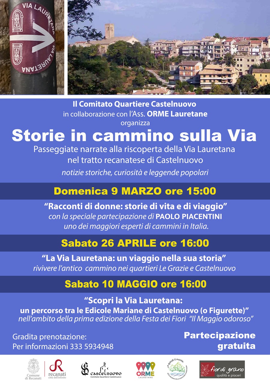 Domenica 9 marzo ore 15.00: “Racconti di donne: storie di vita e di viaggio” con la speciale partecipazione di Paolo Piacentini, uno dei massimi esperti di cammini in Italia. Il tour sarà condotto da Chiara Serenelli e Valentina Nardi dell’Associazione Orme Lauretane, con letture a cura di Paolo Magagnini.