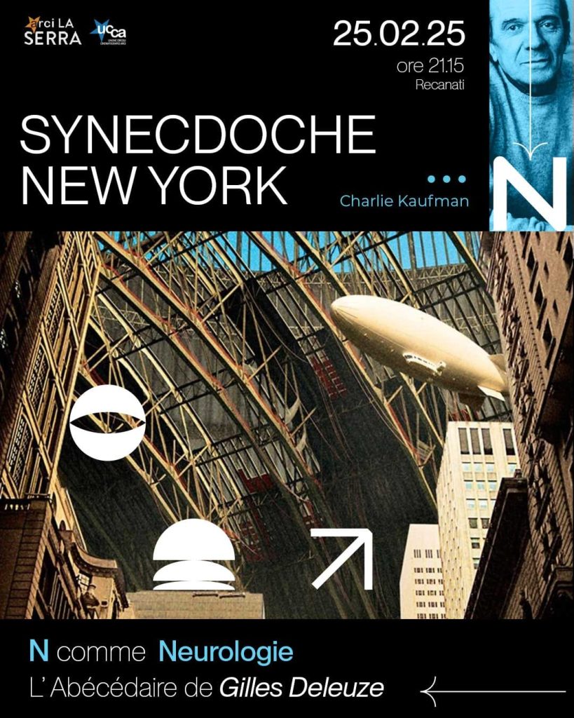 Martedì 25 febbraio 2025 alle ore 21:15, presso il Circolo ARCI/UCCA La Serra di Recanati, verrà proiettato il film “Synecdoche New York” di Charlie Kaufman. Il film verrà preceduto da un estratto dell’intervista televisiva “L’ Abecedaire de Gilles Deleuze” andato in onda sul canale Arté dopo la sua morte. La lettera dell’ abbecedario sarà questa volta “N comme Neurologie”.