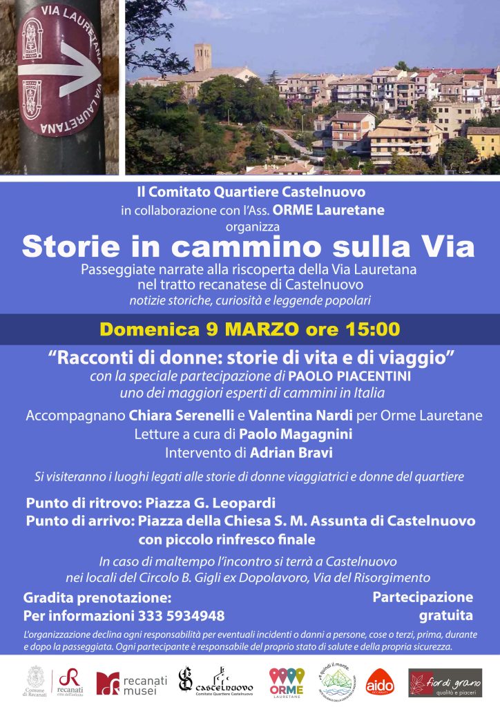 Domenica 9 marzo, in occasione della Giornata Internazionale della Donna, si svolgerà la prima passeggiata narrata dal titolo “Racconti di donne: storie di vita e di viaggio”, parte integrante del progetto “Storie in cammino sulla Via”, organizzato dal Comitato Quartiere Castelnuovo in collaborazione con l’Associazione ORME Lauretane, in un periodo significativo come il Giubileo 2025. L’evento, patrocinato dal Comune di Recanati ha come partner Recanati Musei e offre l’opportunità di riscoprire l’antica Via Lauretana, il cammino di peregrinazione dedicato alla Vergine Maria, nel suggestivo tratto recanatese di Castelnuovo, dato che Porta Cannella era una delle tappe storiche di questo percorso.