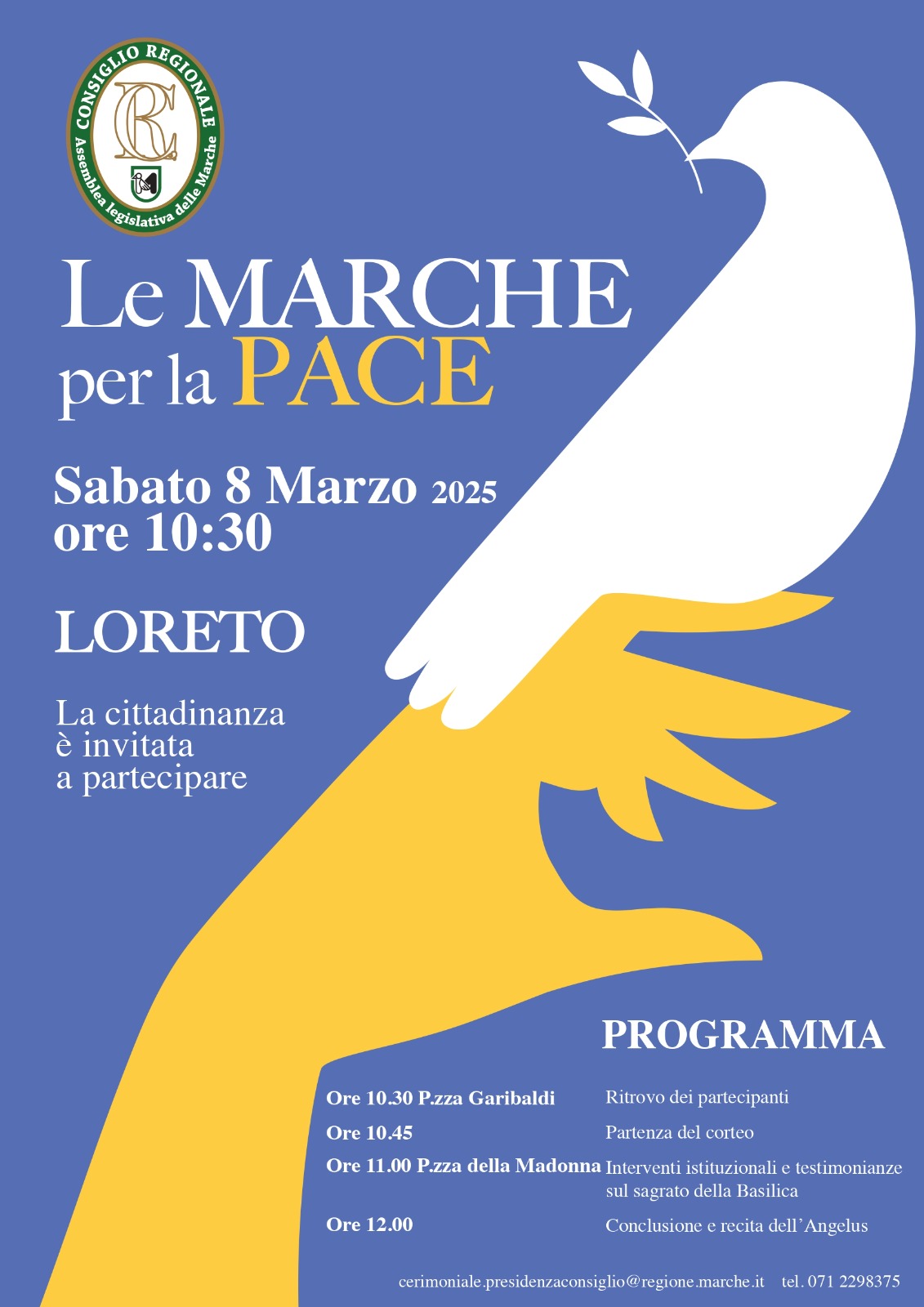 Nuova edizione della manifestazione per la pace dal titolo “Le Marche per la pace” organizzata dal Consiglio regionale che si terrà sabato 8 marzo a Loreto.