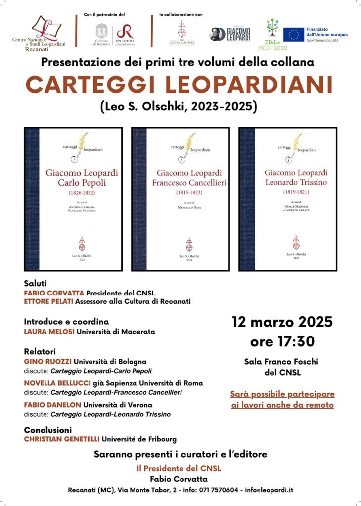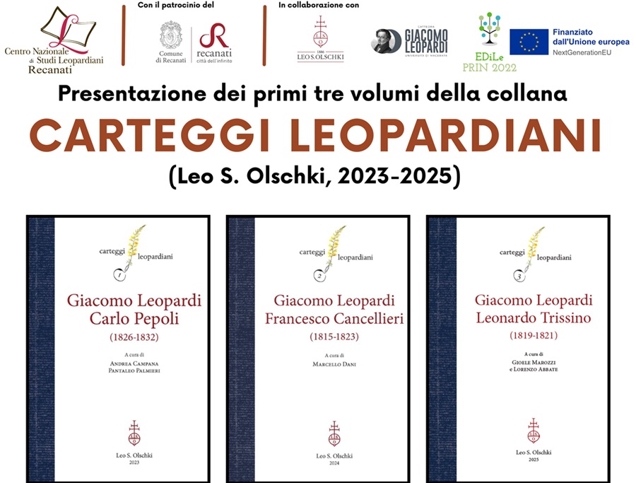 L’evento è organizzato con il patrocinio del Comune di Recanati in collaborazione la Casa editrice Olschki di Firenze e la Cattedra “Giacomo Leopardi” dell’Università degli Studi di Macerata.
