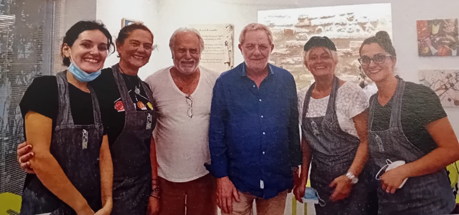 Prima di ripartire, non mancò di lasciare un altro prezioso ricordo: una foto di gruppo con le titolari del ristorante e del famoso e storico negozio di Pasta fresca d’Andrea – sorridenti accanto a lui, in un momento che oggi suona come un piccolo omaggio a un uomo che ha saputo unire talento e umanità.