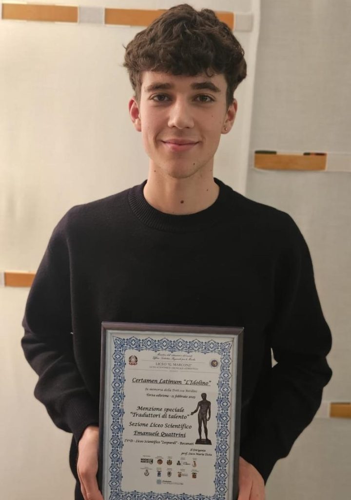 L’alunno Emanuele Quattrini (classe IVD- Indirizzo scientifico) premiato con una menzione speciale come “Traduttore di talento” cimentandosi in una difficile traduzione di un brano di Valerio Massimo.