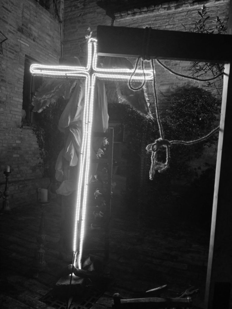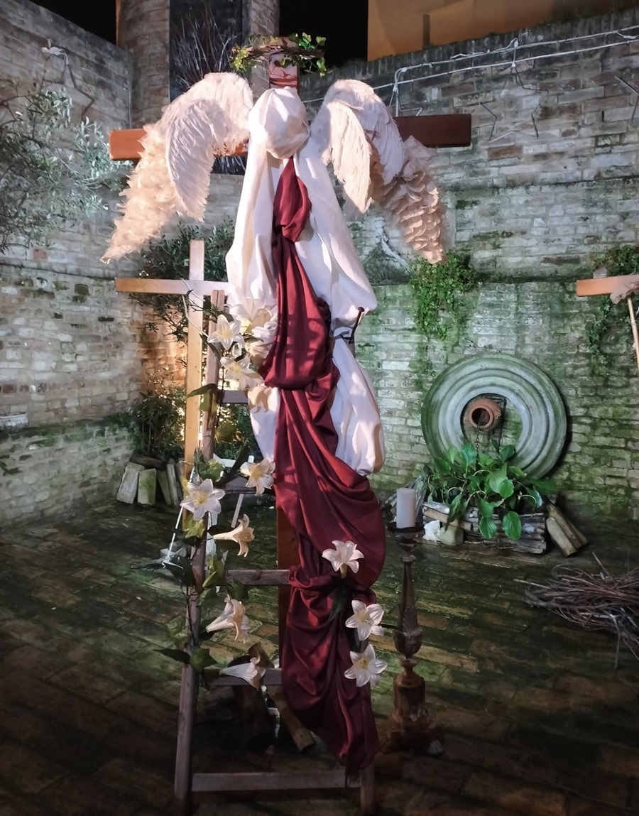 L’ allestimento sarà visibile per tutto il periodo pasquale presso il posto di guardia sotto all’arco di Porta Marina, a Recanati. È stato pensato proprio attraverso le eteree figure degli angeli che ci guidano e ci proteggono, figure che spesso si materializzano anche in chi dona aiuto all’altro, al vicino cui tende una mano. Questi Angeli sono rappresentati dalle bianche ali ai lati della Croce. La Pasqua cristiana è Resurrezione e la Resurrezione passa anche attraverso il rinnovamento e la solidarietà.