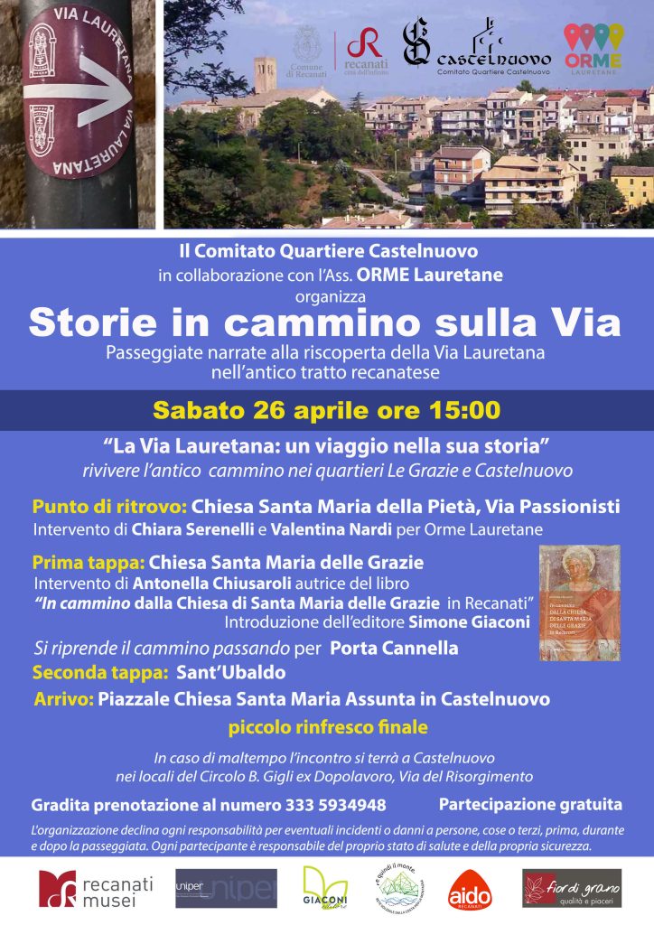 L’evento, organizzato dal Comitato Quartiere Castelnuovo in collaborazione con le associazioni Orme Lauretane, E quindi il monte e AIDO Recanati, è patrocinato dal Comune di Recanati e ha come partner Uniper Recanati “Don Giovanni Simonetti” e Recanati Museo.