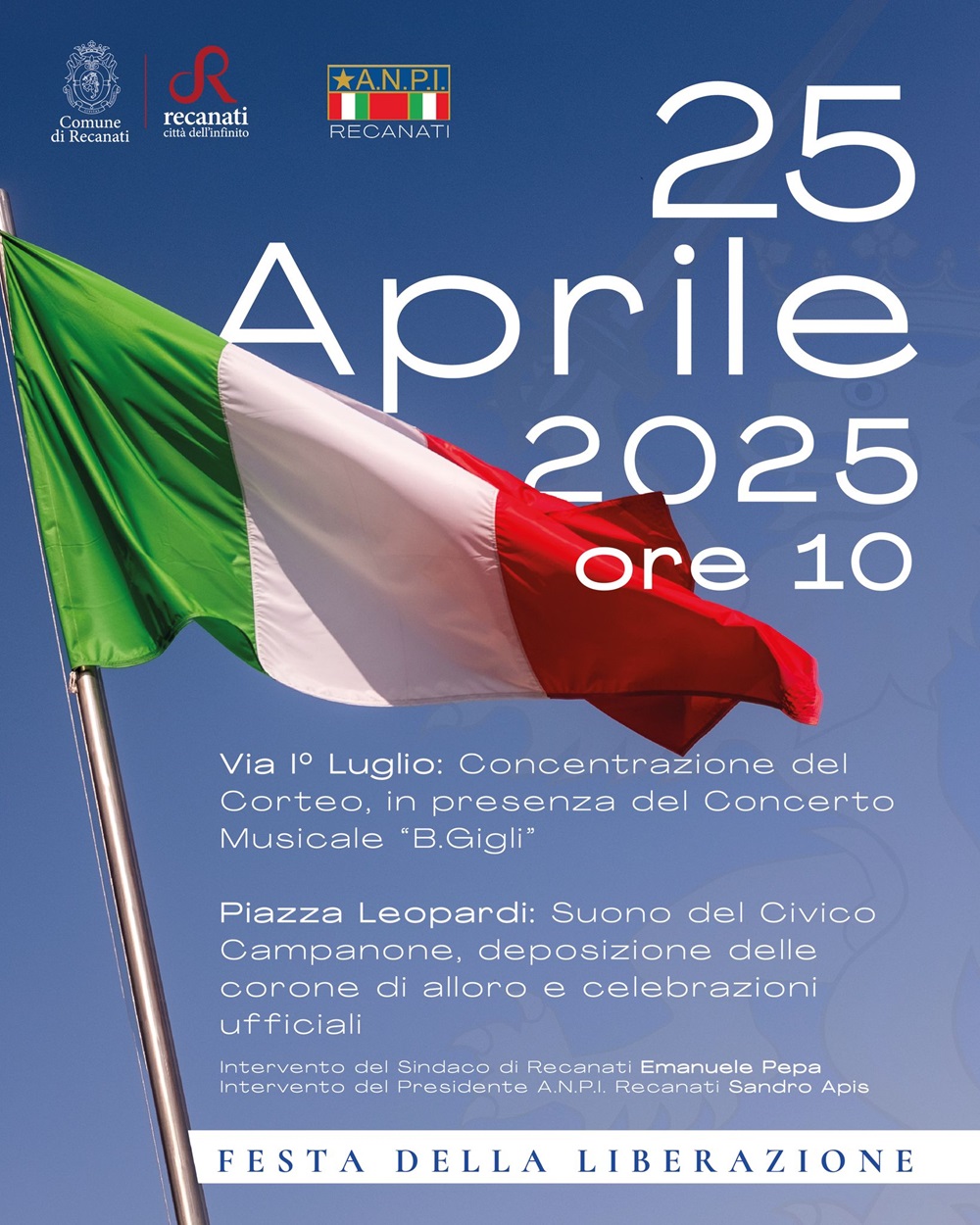 “Sarà una manifestazione all’insegna della sobrietà nel rispetto del lutto per la morte del Santo Padre – ha dichiarato il sindaco di Recanati Emanuele Pepa – Tuttavia, resta dovere dell’Amministrazione comunale e della comunità recanatese onorare quanti sacrificarono la propria vita per assicurare alla Nazione un futuro di libertà e democrazia, che costituiscono i valori fondanti della nostra Repubblica”.