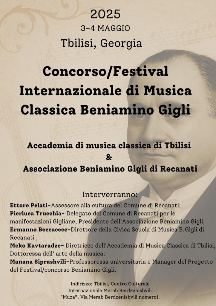 Un ponte culturale tra Recanati e la capitale georgiana Tbilisi prende forma nel segno della grande musica lirica. Sabato e domenica la città caucasica ospita il Concorso/Festival Internazionale di Musica Classica “Beniamino Gigli”, un evento che celebra uno dei più grandi tenori della storia e apre a nuove prospettive di collaborazione tra l’Accademia di musica classica di Tbilisi e l’Associazione Beniamino Gigli di Recanati.
