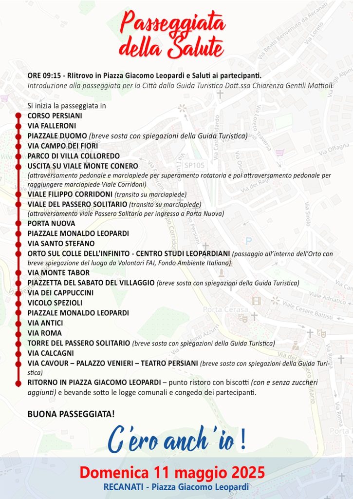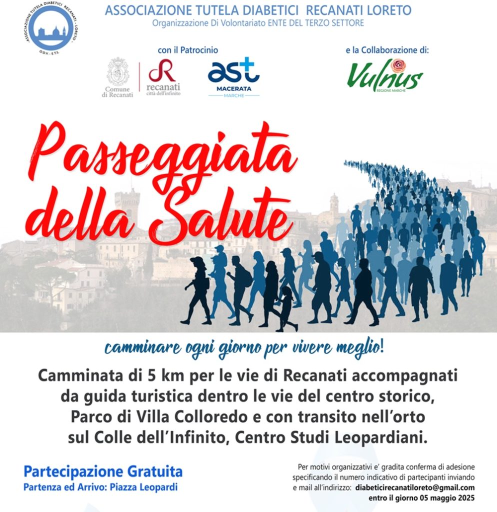 Camminare fa bene a tutti. Con questo presupposto assodato che l’Associazione Tutela Diabetici Recanati Loreto, Organizzazione di volontariato ed Ente del Terzo Settore ha organizzato per domenica prossima 11 maggio la “Passeggiata della Salute”, un percorso di 5 Km nel centro di Recanati, accompagnati da guida turistica e con transiti a Villa Colloredo e presso l’Orto del Colle dell’Infinito gestito dal FAI. Ritrovo alle ore 09:15 in Piazza Giacomo Leopardi e partenza dopo un breve saluto del Sindaco Emanuele Pepa e di Gabriele Brandoni Direttore Responsabile U.O.S.D. Diabetologia e Nutrizione Clinica AST di Macerata. L’Iniziativa gode del Patrocinio del Comune di Recanati e dell’Azienda Sanitaria Territoriale di Macerata.