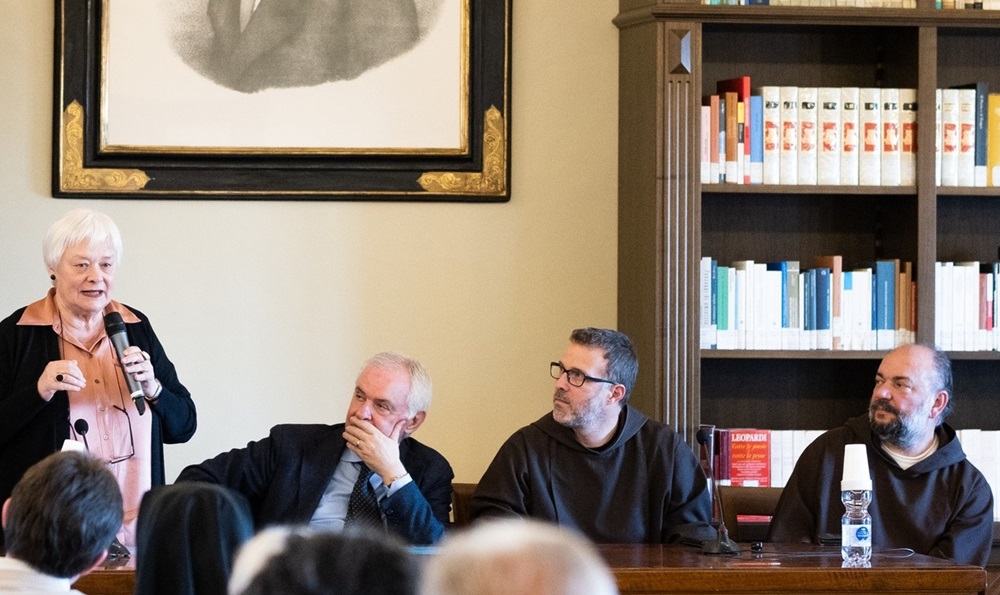 La prof di Unimc Letizia Pellegrini ha portato il saluto del rettore John McCourt e ha aggiunto: «quando il territorio chiama, l’università deve rispondere, è uno scambio fondamentale: trasferire, mediare e mettere a disposizione è operazione molto feconda, abbiamo aderito con entusiasmo a questo progetto dei Cappuccini, li fiancheggiamo in questa miniera di iniziative. Come storica del cristianesimo propongo alcune riflessioni: il linguaggio corso qui dentro finora è amicizia, amore per l’uomo. Oggi viviamo in pace ma viviamo l’incubo vicino a noi. Mi stupisce vedere quanti fili si possono annodare attorno alla passione: tutti hanno punti di vista diversi ma prima o poi si intrecciano, così anche Recanati, Leopardi e i Cappuccini. Dobbiamo mettere in luce quello che di vivo abbiamo sotto gli occhi».
