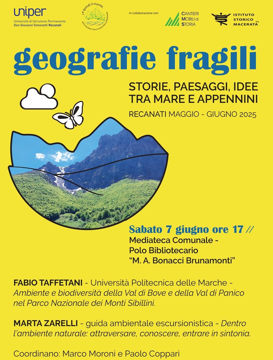 GEOGRAFIE FRAGILI – Terza e ultima tappa, sabato 7 giugno (alle ore 17 presso la Mediateca Comunale di Recanati), all’insegna della biodiversità: quella del paesaggio vegetale – attentamente studiato dall’équipe di Fabio Taffetani- nella Valle del Bove e della Valle del Panico che rappresentano un patrimonio ambientale delicato e unico, all’interno del Parco Nazionale dei Monti Sibillini. Con Marta Zarelli scopriremo insieme che cosa significa camminare nella biodiversità, vale a dire nella sorprendente molteplicità dei paesaggi che i territori appenninici ci offrono: da quelli più conosciuti e ammirati a quelli più comuni e vicini alla nostra quotidianità, ma non per questo meno affascinanti.