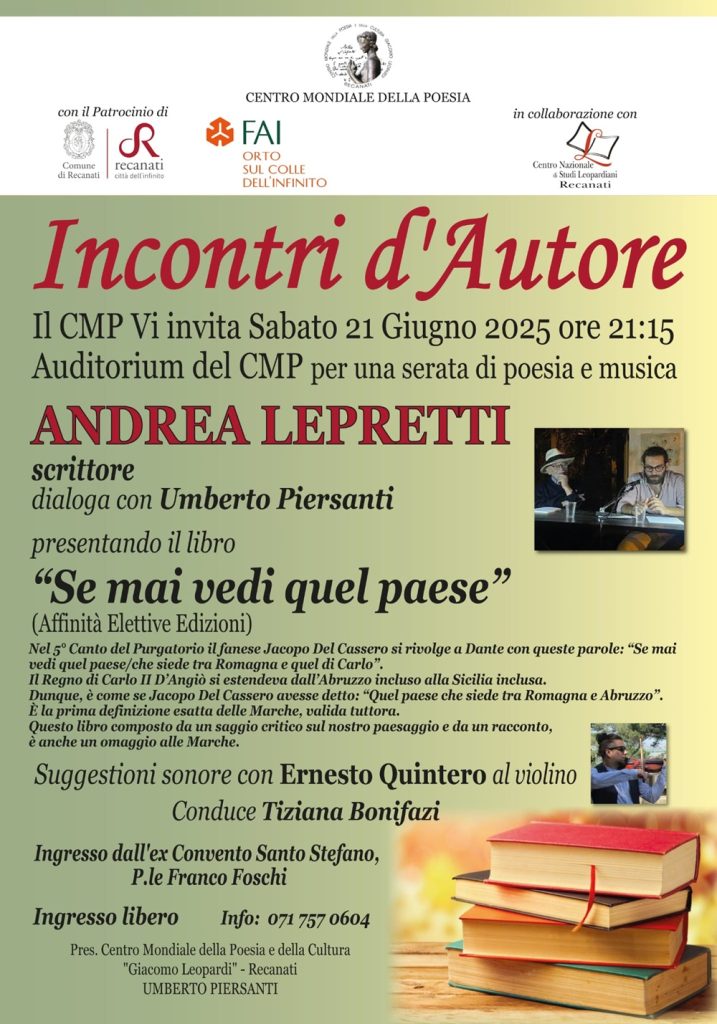 Sabato 21 giugno alle ore 21.15 immancabile appuntamento con il Centro Mondiale della Poesia di Recanati, presso l’Auditorium dello stesso, in P.le Franco Foschi – Recanati (ex S.Stefano): “INCONTRI d’AUTORE”.
