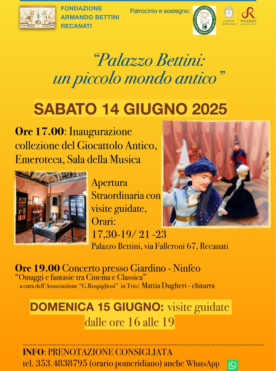 “Palazzo Bettini: un piccolo mondo antico” a cura della Fondazione “Armando Bettini” si svolge con il Patrocinio e la Compartecipazione dell’Assemblea Legislativa Consiglio Regionale Marche, Comune di Recanati Assessorato alla Cultura.