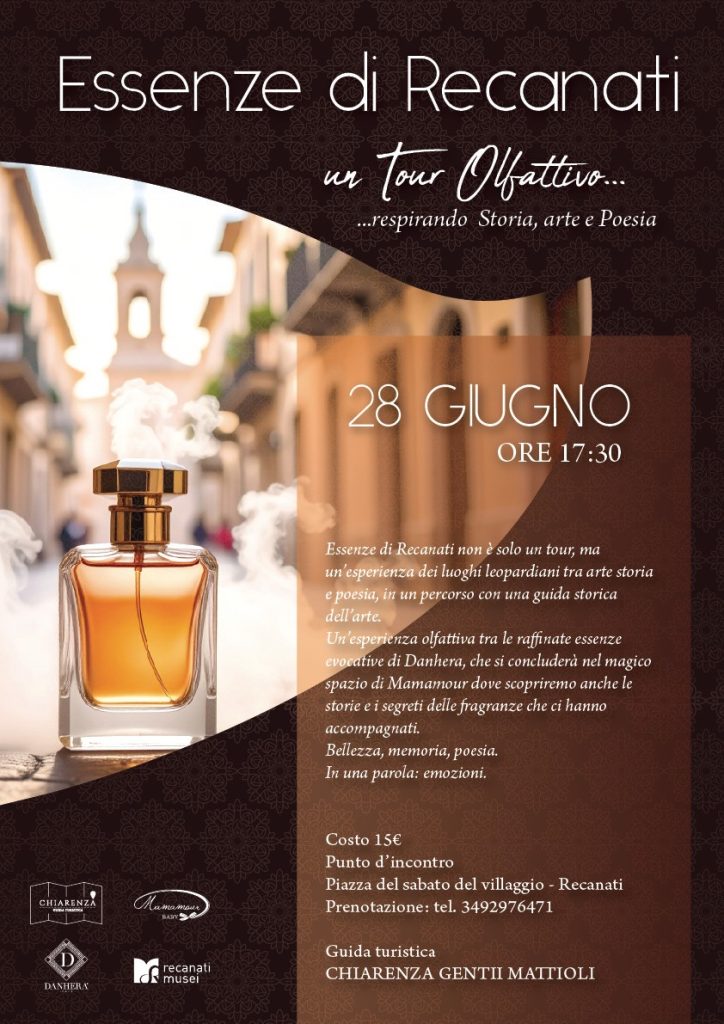 Il percorso, inedito e coinvolgente, condurrà i partecipanti attraverso i luoghi simbolo della memoria leopardiana, intrecciandosi con la storia, l’arte, la tradizione teatrale, religiosa e artigianale, rappresentata dalla celebre Sartoria Latini. Un viaggio emozionale in cui i profumi si fanno narrazione, rievocando suggestioni poetiche e culturali attraverso l’olfatto.