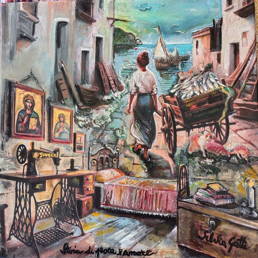 Questo racconto non vive solo attraverso le parole, ma prende forma anche in un’opera pittorica, dipinta dalla stessa Silvia Gatti e pubblicata a corredo della storia. Il quadro è un omaggio alla vita marinara e alla sua tradizione: una pesciarola che, con camicia bianca e gonna lunga, tira il suo carretto, lungo i vicoli con il mare in lontananza, testimone silenzioso di sacrifici e speranze.