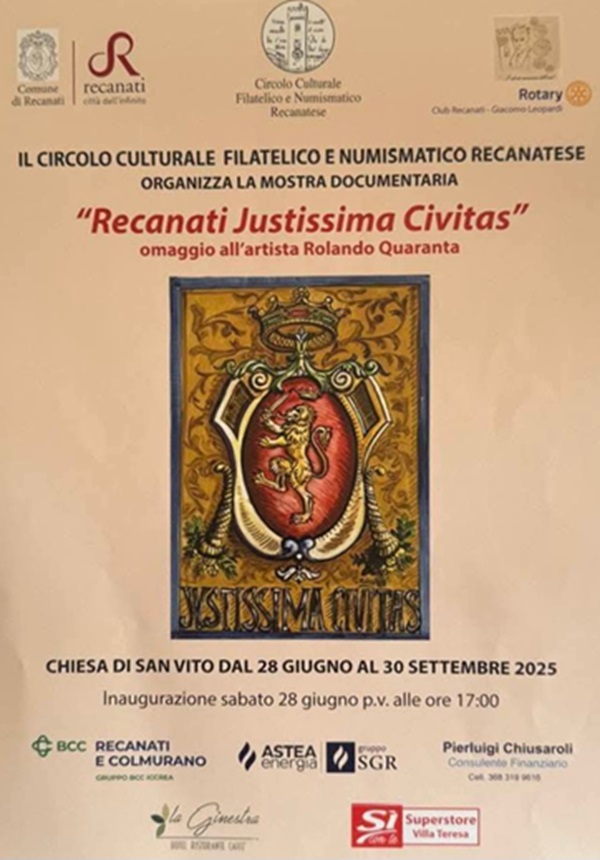 Il Circolo Culturale Filatelico e Numismatico Recanatese ha organizzato presso la Chiesa di San Vito una nuova ed interessantissima mostra documentaria sulla Città di Recanati denominata “Recanati Justissima Civitas”.