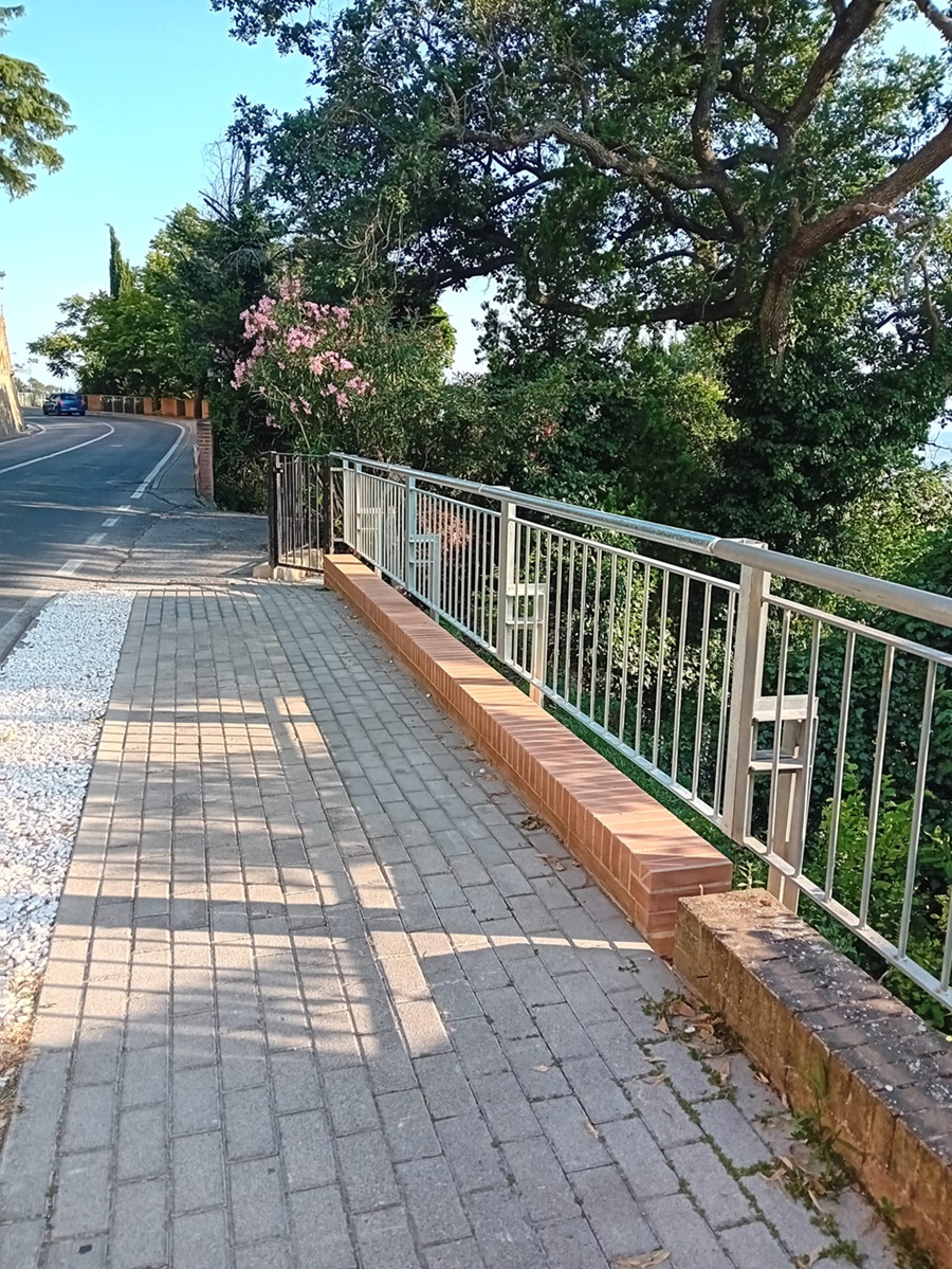 Poi vennero le piogge d’autunno, e con esse il cedimento definitivo. Solo allora l’Amministrazione ha affidato i lavori alla ditta Artedil, realtà locale esperta in restauri e consolidamenti, che ha riportato sicurezza e decoro laddove sembravano perduti. Oggi quel tratto di marciapiede, percorso ogni giorno da passi lenti e pensieri profondi, è di nuovo solido sotto i piedi. La balaustra, ripristinata, torna a disegnare il confine tra il cammino e lo sguardo che si apre sulla città.