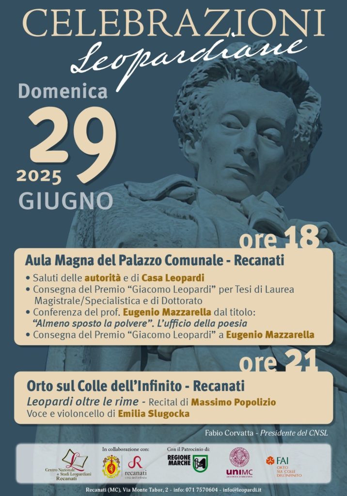 E’ il giugno leopardiano e il prossimo 29 giugno, più o meno “in sul calar del sole”, Recanati ricorda il Poeta nel 227° anniversario dalla nascita di Giacomo Leopardi. Secondo la tradizione – che si ripete ogni anno non ritualmente ma variando contenuti, temi e protagonisti – si inizia (alle 18) nell’aula magna del Municipio. Si parte con i saluti del presidente del Centro nazionale di studi leopardiani Fabio Corvatta, del rappresentante di Casa Leopardi e del sindaco Emanuele Pepa.Si inizierà poi ad esplorare i paesaggi letterari leopardiani con la consegna ai vincitori e alle vincitrici del premio Giacomo Leopardi per tesi di laurea magistrale, specialistica e di dottorato.