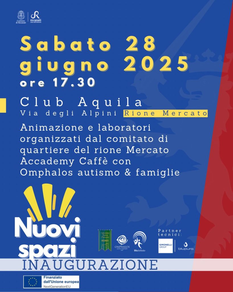 Un nuovo spazio pubblico, nel cuore del Rione Mercato, a Recanati. riapre alla città oggi pomeriggio alle ore 17:30 quando saranno inaugurati i nuovi spazi realizzati nell’ex Club Aquila, in via degli Alpini, un’area completamente riqualificata grazie a un finanziamento di 400mila euro per la rigenerazione urbana (fondi PNRR), restituita alla cittadinanza come centro di aggregazione, attività sportive, sociali e inclusive per tutte le età.