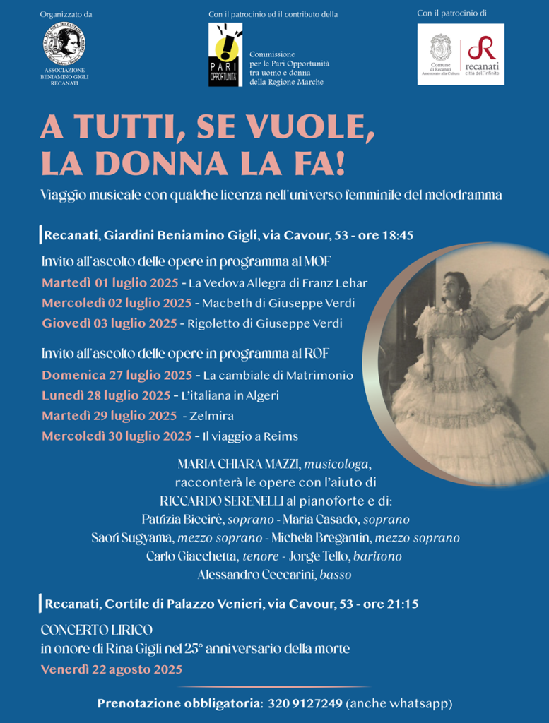 Tutti gli incontri avranno come relatrice la Prof. Maria Chiara Mazzi, musicologa già docente al Conservatorio Rossini di Pesaro, che accompagnerà il pubblico in un racconto ricco di aneddoti, letture critiche e approfondimenti sul ruolo delle donne nelle opere liriche. Il maestro Riccardo Serenelli avrà il delicato compito di tessere il tappeto musicale e di accompagnare gli artisti lirici che si avvicenderanno nelle serate che si terranno ai Giardini Gigli con inizio alle 18.45.