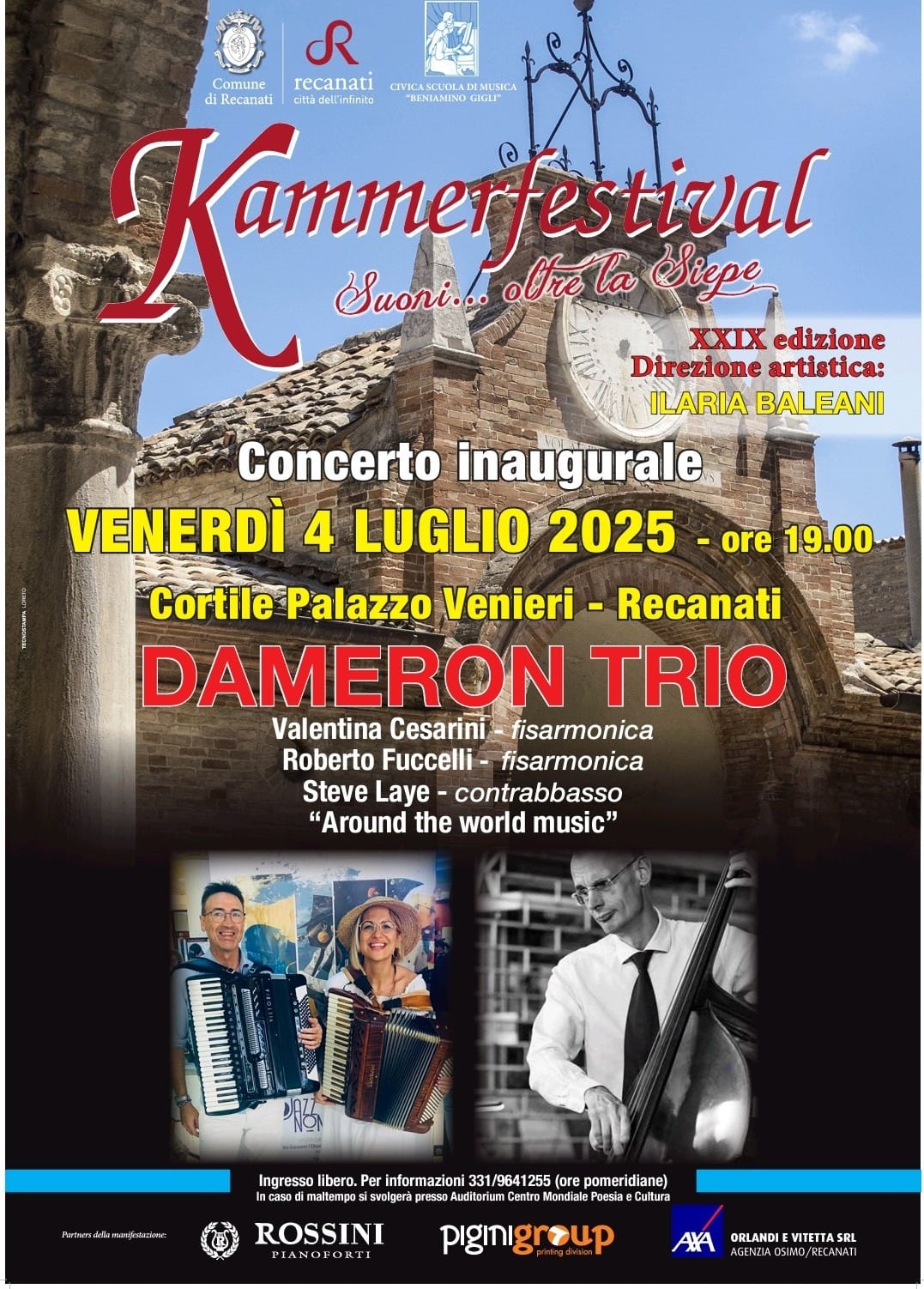 Tempo di estate, tempo di musica e di…. Kammerfestival! VENERDI 4 LUGLIO 2025 ore 19.00 concerto inaugurale presso Cortile di Palazzo Venieri con il particolare Dameron Trio, formazione strumentale di 2 fisarmoniche e contrabbasso, concerto che si preannuncia effervescente e ricco di brio.