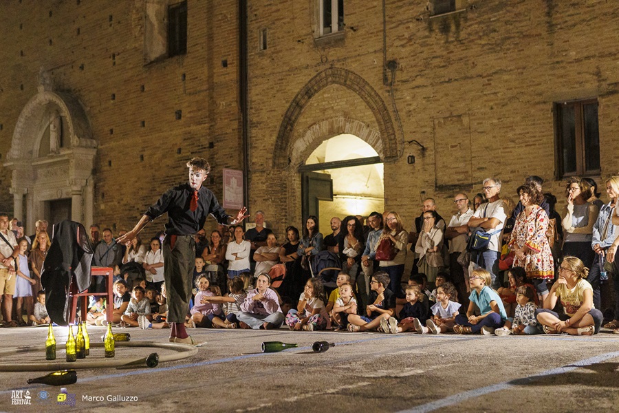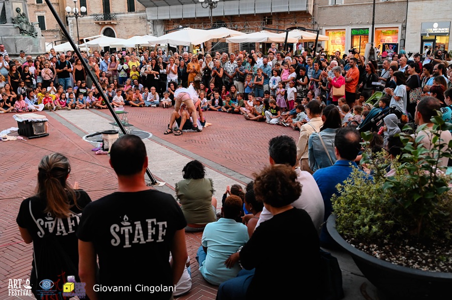 Oltre ogni aspettativa la partecipazione del pubblico alla prima serata di Art Festival, sabato 12 luglio, nel centro storico di Recanati. Un flusso armonioso di persone ha animato i tanti spazi dedicati a circo contemporaneo, danza, musica, sand art, artigianato e aree food & drink. Il segreto? Il cuore: quello del direttore artistico Gian Luigi Mandolini, che da dieci anni cura ogni dettaglio; quello degli spettatori, che ha battuto all’unisono con gli artisti; quello dello staff, unito da amicizia e passione; e quello della città, sempre fonte d’ispirazione.