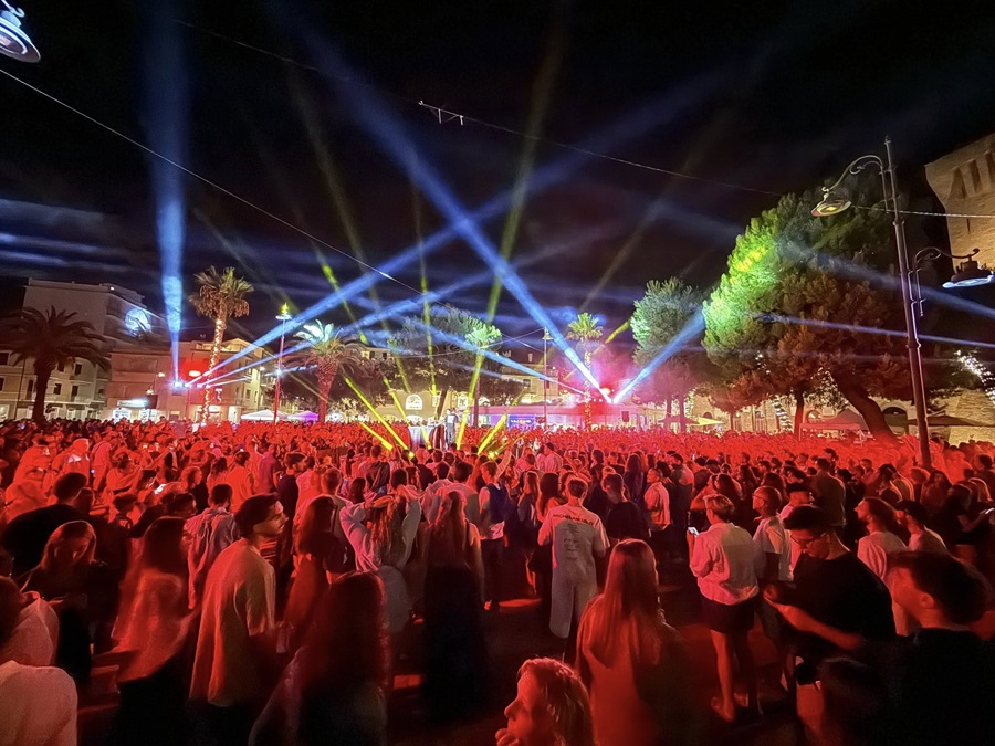 L’evento, firmato DOOM Studio, ha unito musica, luci e arti visive in un’esperienza senza precedenti. La facciata del Kursal è diventata una tela luminosa grazie al videomapping, mentre la consolle, posizionata su una pedana girevole sopra la fontana della piazza, ha proiettato il pubblico in uno spettacolo a 360 gradi.