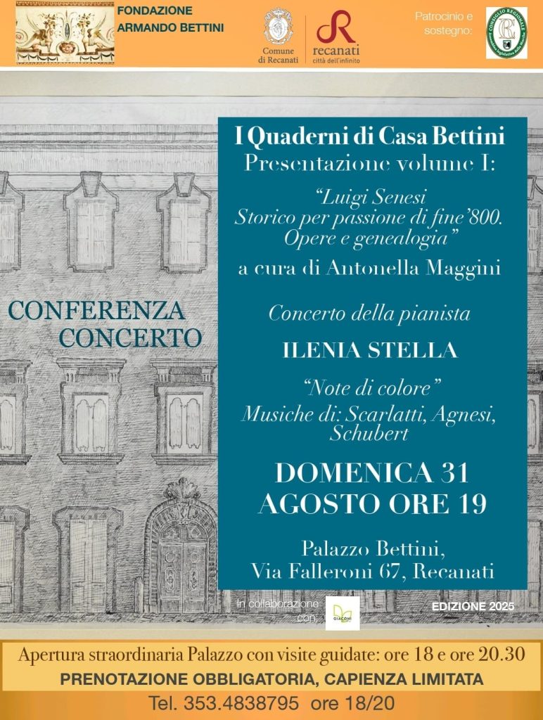 A causa dell’instabilità metereologica, la Fondazione “Armando Bettini” con sede in via Falleroni ha deciso di rimandare a domenica prossima, sempre alle ore 19 la Conferenza – Concerto “Luigi Senesi, storico per passione fine ‘800” per inaugurare la collana editoriale “I quaderni di Casa Bettini” dedicata ad una delle più importanti opere della biblioteca della Fondazione.