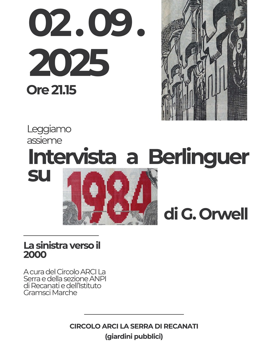 Con l’introduzione e il coordinamento di alcuni soci ARCI, sarà letta e discussa in modo collettivo l’intervista di Ferdinando Adornato ad Enrico Berlinguer su “1984” di George Orwell e sul futuro della Sinistra, pubblicata per la prima volta in un supplemento all’Unità nel dicembre del 1983.