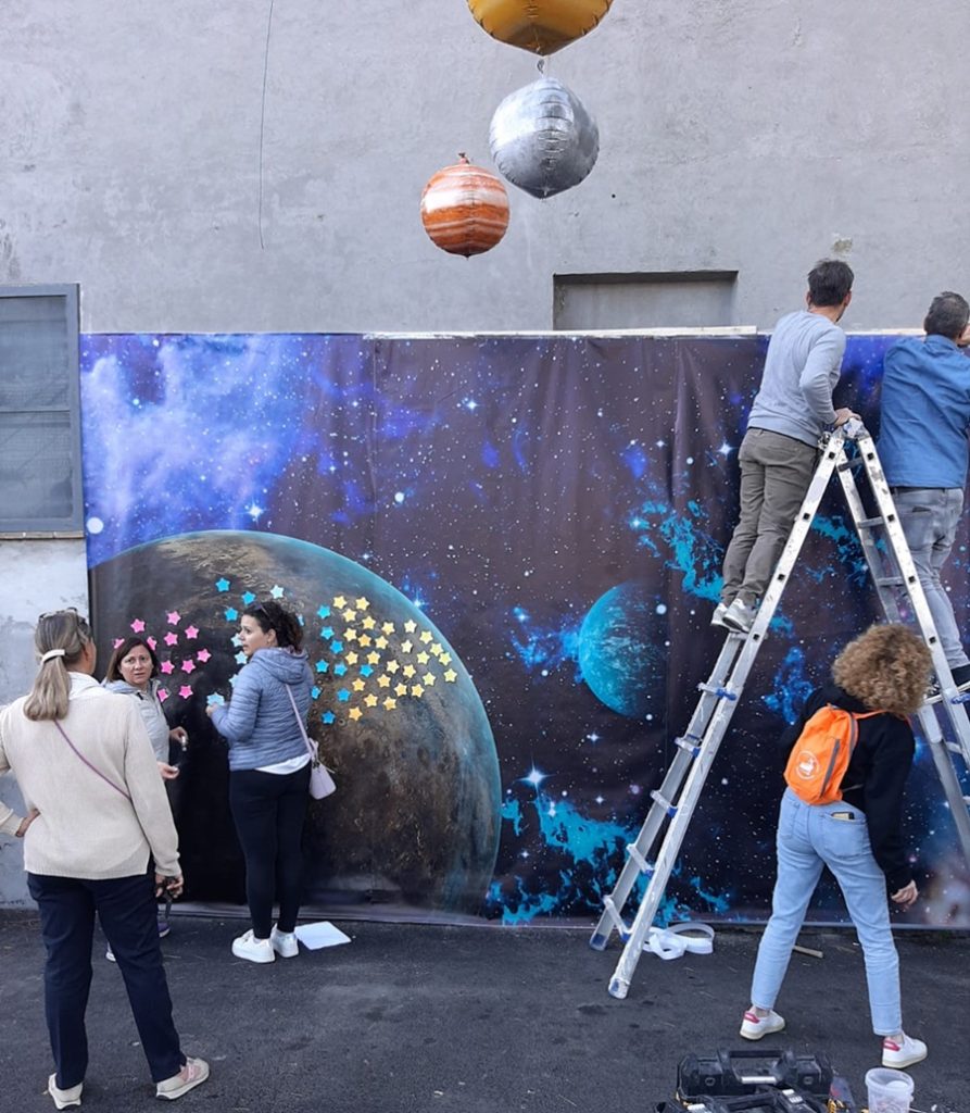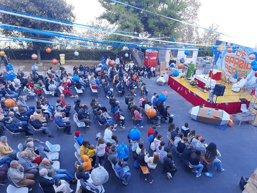 Ci accoglie il “pincetto”, magico piazzale accanto alla Chiesa, addobbato con una scenografia da grandi occasioni. Cento pianeti che arricchiscono un cielo azzurro ornato di fili colorati che si confondono con la luce e il sole. E’ la festa del ciao che l’Azione Cattolica dei Ragazzi propone a tutti i ragazzi all’inizio del nuovo anno catechistico. Decine di educatori si sono trovati all’alba per allestire il tutto in un clima di grande gioia e collaborazione. Il nostro parroco, don Sergio, ci accoglie con sorrisi, caffè e dolci. Alle 10,30 il pincetto è stracolmo di ragazzi, genitori e parrocchiani. Inizia la Messa in un clima di grande partecipazione e concentrazione. Don Sergio parla della festa “spaziale” che stiamo vivendo e del fatto che nella Chiesa siamo aiutati a guardare in alto, a scoprire i doni di Dio e a cercare di vivere il suo messaggio in gruppo, come gli equipaggi della stazione spaziale internazionale che da oltre venti anni si alternano da ogni parte del mondo, per fare esperimenti utili per la vita di tutti gli uomini. I canti aiutano piccoli e grandi a pregare intensamente. Dopo la Messa si imparano e si ballano canzoni dell’ACR e si fanno percorsi per allenarsi, sia fisicamente che psicologicamente, a diventare astronauti.