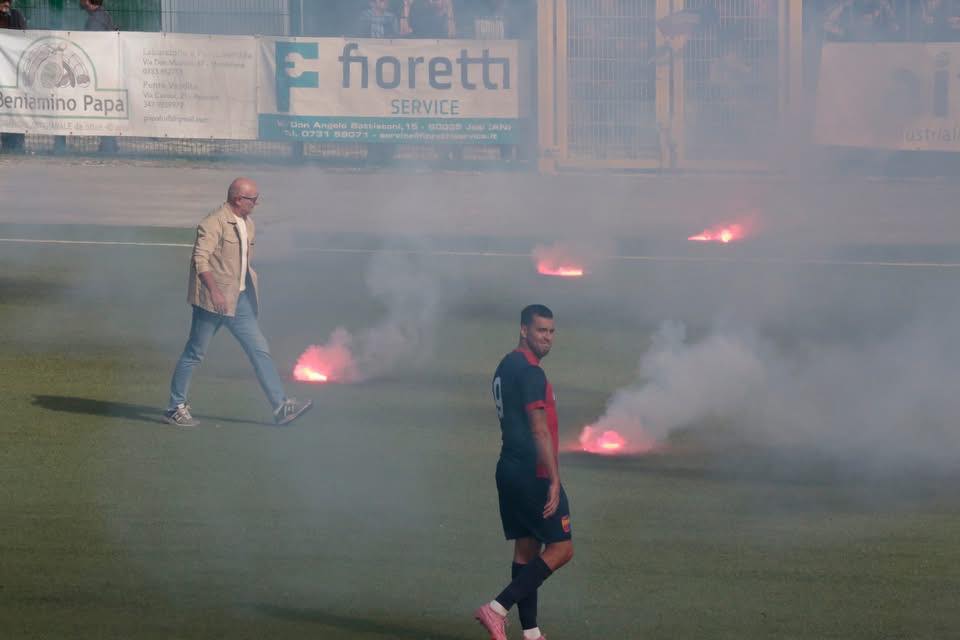 L’episodio si è verificato intorno al decimo minuto del primo tempo, quando dal settore ospiti sono partiti numerosi fumogeni, lanciati in segno di protesta contro la società rossoblù. Il direttore di gara è stato costretto a sospendere la partita per alcuni minuti, mentre in campo interveniva direttamente il presidente del Montefano, Stefano Bonacci, che come di consueto segue la squadra dalla panchina.