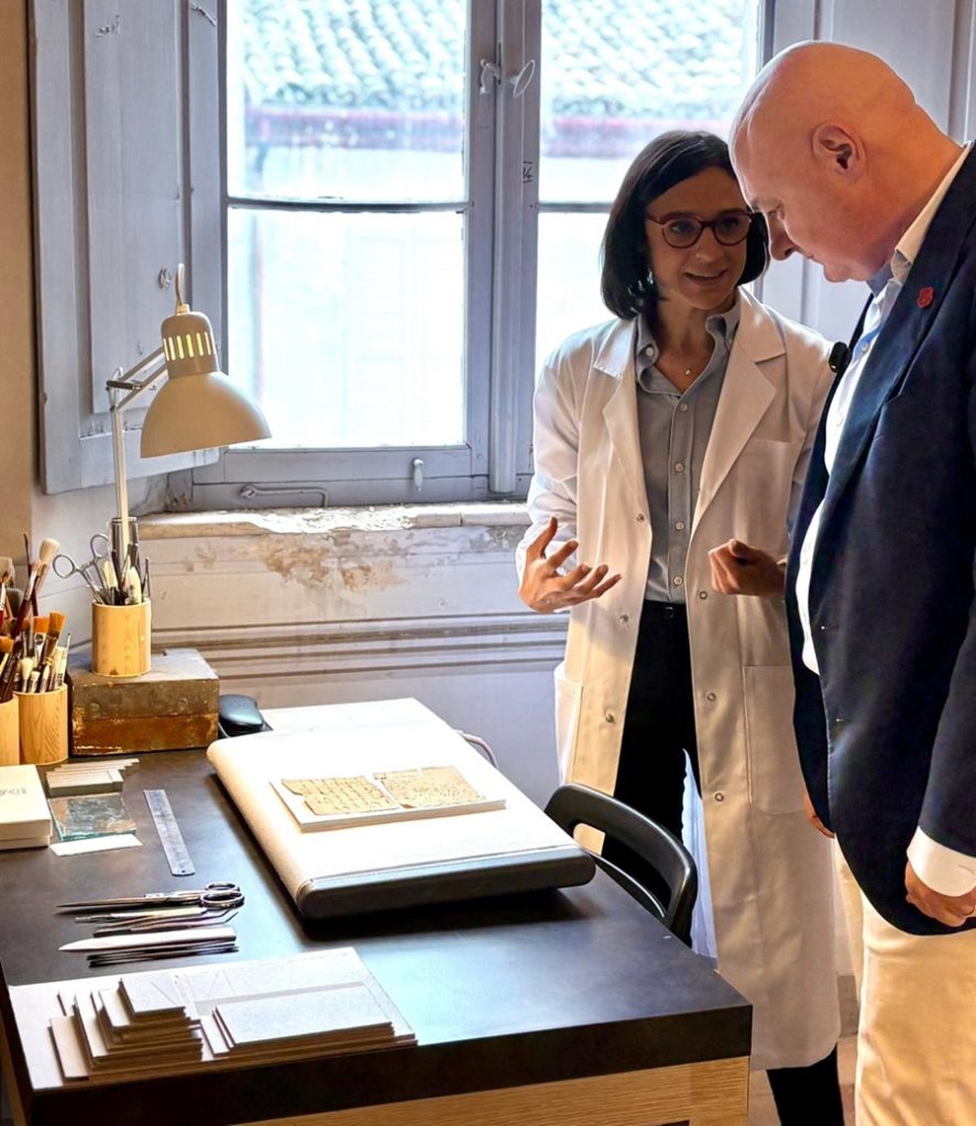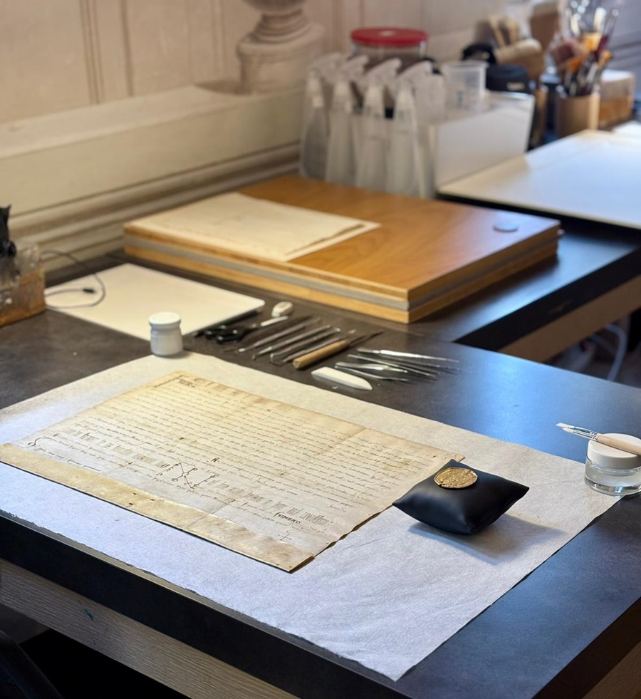 Due lettere di Giacomo Leopardi e la Bolla Aurea di Federico II protagoniste di un restauro ‘interattivo’ tra operatori e visitatori. L’intervento, alla sua prima giornata, è stato promosso dal Comune di Recanati e finanziato e patrocinato da ANCoS e Confartigianato Macerata-Ascoli Piceno-Fermo.