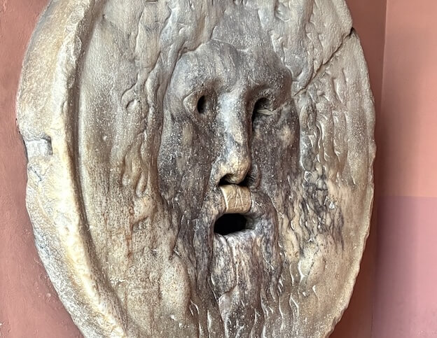 Arriviamo in Piazza Bocca della Verità dove si trova l’antico mascherone in marmo, uno dei simboli più celebri di Roma, collocato dal 1632 nel pronao della Basilica di Santa Maria in Cosmedin. La Bocca della Verità è un buco pericoloso per i bugiardi. Secondo la leggenda morde la mano a chi mente. Il “buco” della Bocca della Verità non è un semplice foro, ma una soglia, un varco. È il punto di non ritorno che separa l’innocenza dalla colpevolezza. Il passaggio della mano attraverso questo “buco” simboleggia il superamento di un esame morale o il confronto con il proprio segreto.